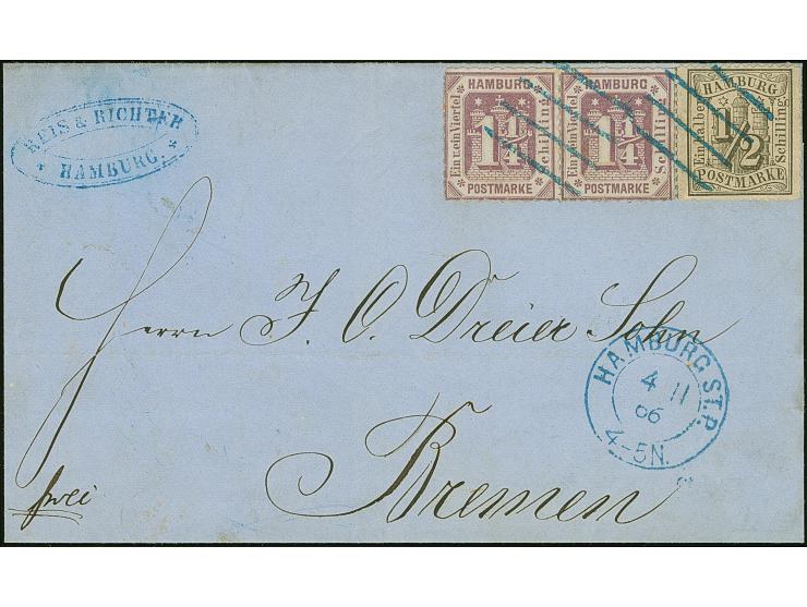 1¼ Sch. grauviolett im waagerechten Paar, farbfrisch und gut durchstochen, zusammen mit 1 Sch. schwarz, mit blauem Strichstempel und nebengesetztem “HAMBURG ST.P. 4 11 66” auf Briefhülle nach Bremen. Eine sehr seltene Frankaturkombination; PROFI hat nur 2 weitere registriert.