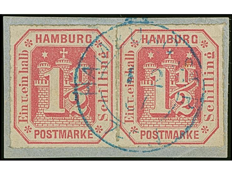 1½ Sch. rosakarmin im waagerechten Paar, mit sauber aufgesetztem blauen DKr. aufBriefstück. Rechts oben kleine Druckstelle, sonst tadellos.