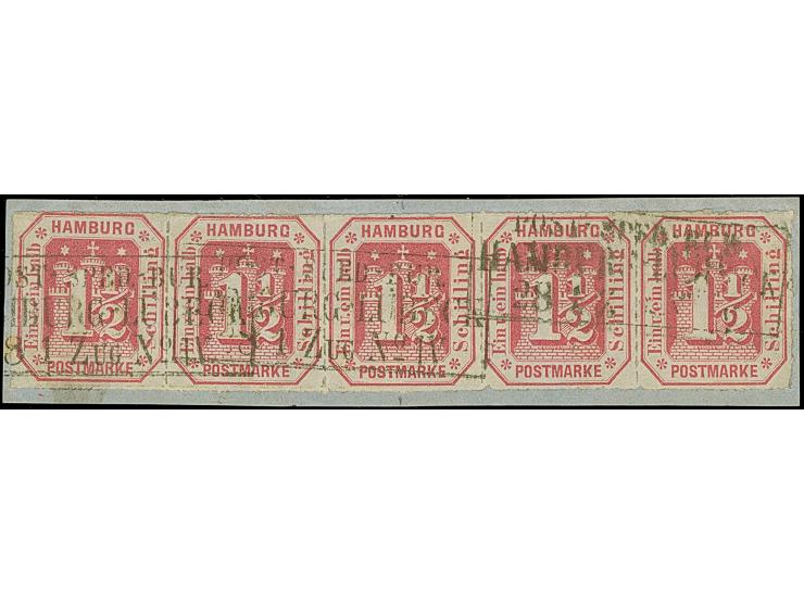 1½ Sch. rosakarmin im waagerechten 5er-Streifen, farbfrisch und einwandfrei durchstochen, mit äußerst seltener Entwertung durch mehrfach aufgesetztem Ra2 “POST SPED.BUR.HAMBURG-LÜBECK, ZUG Nr. 4" auf Briefstück. Größte bekannte Einheit dieser Marke; PROFI hat nur einen weiteren 5er-streifen registriert.