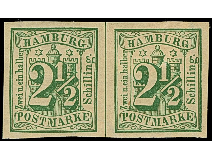 2½ Sch. dunkelolivgrün in 2 stark unterschiedliche Nuancen, jeweils im ungezähnten Paar, ungebraucht mit Originalgummi.