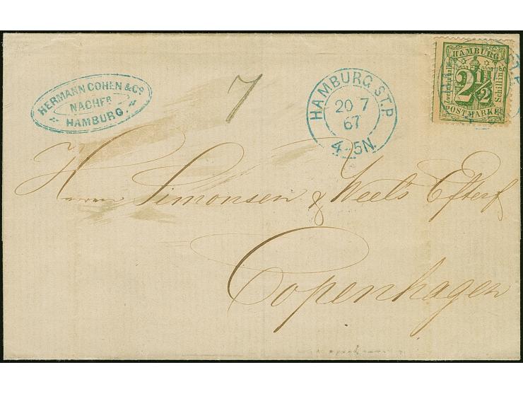 2½  Sch. dunkelolivgrün mit auf- und nebengesetztem blauem DKr. “HAMBURG ST.P. 20/7 67” auf Briefhülle nach Kopenhagen.