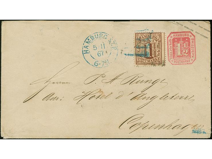 Umschlag 1½ Sch. mit Zufrankatur 1 Sch. braun, mit blauem Strichstempel und nebengesetztem DKr. "HAMBURG ST. P. 5/11 67" nach Kopenhagen, mit Ankunftsstempel. Umschlag etwas unfrisch, die Verschlussklappe etwas fehlerhaft. Eine seltene Kombination; PROFI hat nur eine weitere solche registriert.