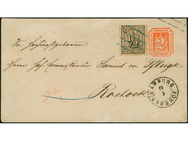 Umschlag 2 Sch. mit Zufrankatur ½ Sch., mit blauem Strichstempel und nebengesetztem Mecklenburger DKr. "HAMBURG BAHNHOF" nach Rostock, mit Durchgangsstempel das Stadtpostamtes und Ausgabestempel. Das Kuvert senkrechte Faltung und oben kleiner Einriss; die Marke kleine Zahnfehler.