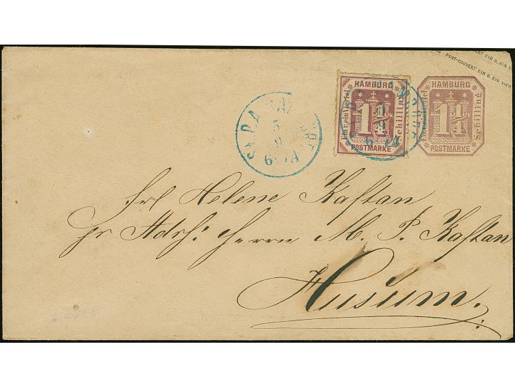 Umschlag 1¼  Sch. mit wertstufengleicher Zufrankatur, Prägedruck 1¼  Sch., mit blauem EKr. " ST. P.A. HAMBURG 5/9" nach Husum, mit Ankunftsstempel. Die rückseitige Verschlussklappe etwas fehlerhaft und der Umschlag unauffällig gereinigt, sonst gute Erhaltung. Eine sehr seltene Kombination; PROFI hat nur 2 weitere solche registriert.