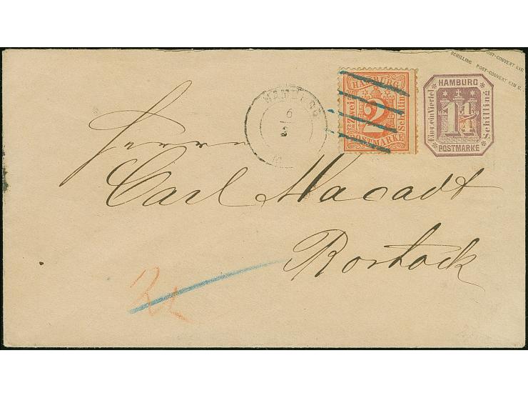 Umschlag 1¼  Sch. mit Zufrankatur 2 Sch. orangerot, mit blauem Strichstempel und nebengesetztem Mecklenburger DKr. "HAMBURG ST. P. 6/3" nach Rostock, mit Ausgabestempel. Die Marke kleine Zahnfehler und ein Zahn leicht stockig, der Wertstempel ganz kleine Verfärbung, sonst gute Erhaltung. Eine wohl einmalige Kombination.