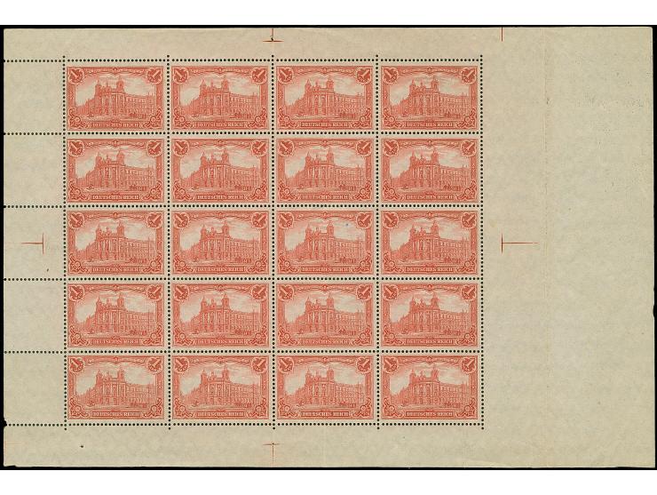 1915, Kriegsdruck 1 M. mit 25:17 Zähnungslöchern im kpl. Bogen mit ca. 6 breitem rechten Rand. Der Bogen ist ohne Gummierung und hat zwei senkrechte Faltungen in der 2. Markenreihe von rechts und im Bogenrand, ansonsten in guter Erhaltung. Diese Art von Bogen wurde zum Archivzwecken in der Reichsdruckerei aufbewahrt und ist in nur wenigen Exemplaren bekannt, Fotoattest Oechsner BPP (2002)
