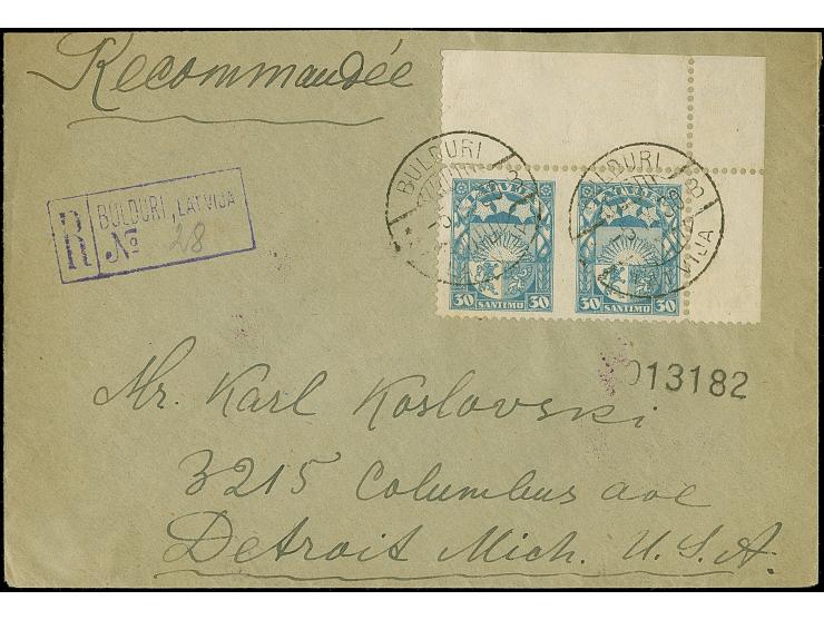 1927, Coat of arms 30 santimi blue, horizontal pair from the upper right sheet margin, imperforated between, tied by cds. “BULDURI -5.XI.30” to registered cover to Detroit with arrival mark, fine and attractive