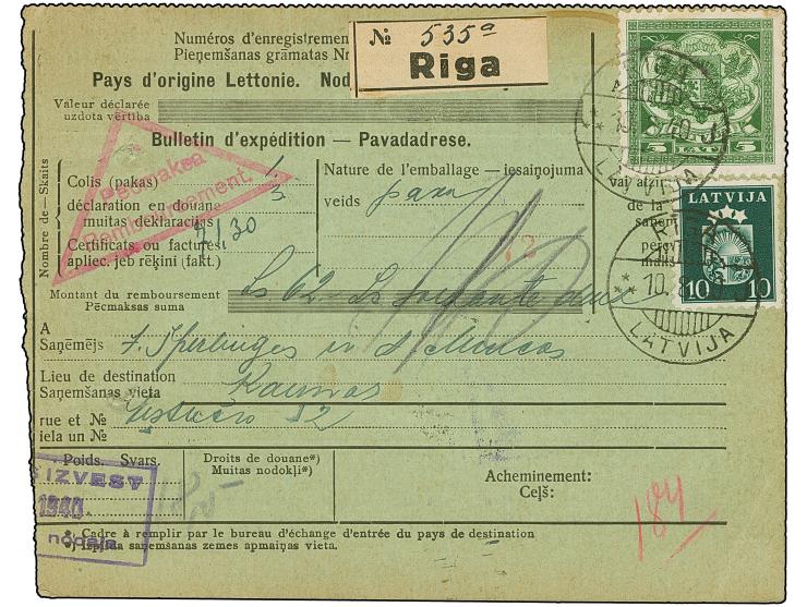 1933, Coat of arms 5 lats green, with additional franking, tied by cds. “RIGA 10.8.40” to parcel card to Kaunas, there franked with
