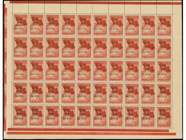 Nordpolflug, 80 Kopken karmin, kompletter Druckbogen der 1. Auflage, Felder 1-30 mit Aufdruck in Type II, Felder 31-50 in Type IIIa, mit den entsprechenden Aufdruckfehlern auf den Feldern 1, 32, 34, 39, 40 und 45, postfrisch, teils kleine Bräunungspunkte, in der Zähnung teils gefaltet, sonst in einwandfreier Erhaltung. Dies ist der einzig bekannte komplette Druckbogen und eine große Seltenheit, ausführliches Fotoattest Bender BPP (2009)