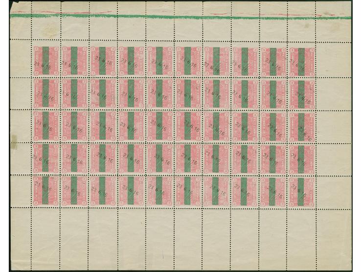 1916, Bestellgeldmarken 3-10 Kopeken mit Aufdruck, je im kompletten Schalterbogen mit allen Rändern, jede Marke mit Datums-L1 “23.6.16”. Die 10 Kopeken auf Feld 9 mit markantem Plattenfehler “weißer Strich durch Marke”, die Ränder teils gering bestoßen und mit Falz fixiert, nur wenige Marken ungebraucht, sonst tadellos postfrisch und sehr dekorativ, u.a. sign. Petriuk