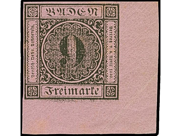 9 Kreuzer auf lilarosa, farbfrisch und allseits voll- bis breitrandige rechte untere Bogenecke, mit 8/9 mm breiten Bogenrändern. Ungebraucht mit vollem Originalgummi, die Marke selbst postfrisch. Im Außenrand Bug, rückseitig ganz leichte Altersflecken, sonst tadellos. In dieser Erhaltung ein Ausnahmestück.