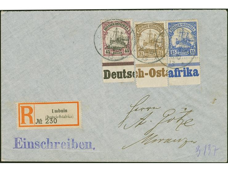 "UMBULU 28.10.13", 3 saubere Abschläge, je auf Unterrandstück 1905/20, 2½ H., 15 H. und 45 H. mit zusammen ergebender Randinschrift “Deutsch-Ostafrika”, auf philatelistischem R-Brief nach Muanza. Ein seltenes Stück in schöner Erhaltung. Fotoattest Jäschke-L. BPP (2026)