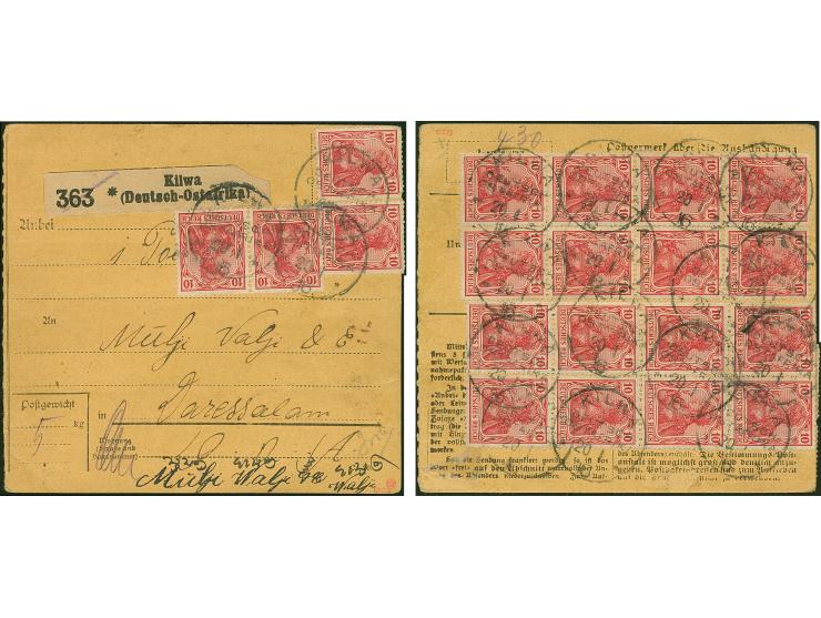 Kreuzer Königsberg: Germania 10 Pfg., 20 Stück in Einheiten, vorder- und rückseitig, mit sauberen Stempeln "KILWA 20 I 16" auf Paketkarte nach Daressalam. Die Karte ist für diese Verwendung bemerkenswert frisch; 4 Werte mit kleinen Zahnfehlern bzw. Berstoßungen durch Randklebung. Eine der großen Seltenheiten der Kolonial-Philatelie; PROFI hat keine weitere reine Mehrfachfrankatur der Königsberg-Ausgabe registriert.