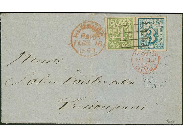 4 Sch. grünoliv und 3 Sch. preußischblau, beide farbfrisch, je voll- meist breitrandig geschnitten, mit sauber aufgesetztem Strichstempel und leicht übergehendem roten "HAMBURG PAID FEBR.16 1860" auf komplettem Faltbrief nach Prestonpans, Großbritannien, mit leicht auf die Frankatur übergehendem Durchgangsstempel von London und Ankunftsstempel vom 20. 2. Das Briefpapier in den Faltungen teils etwas getrennt, die Marken waren gelöst und sind nicht ganz korrekt replaziert, sonst frische und tadellose Erhaltung. Eine der größten Frankatur-Seltenheiten Hamburgs; ProFi hat nur 3 weitere solche Kombinationen registriert. Signiert Calves, Qualität-Prüfungsbefund Maria Brettl (1987) und Fotoattest Huylmans BPP (2026)