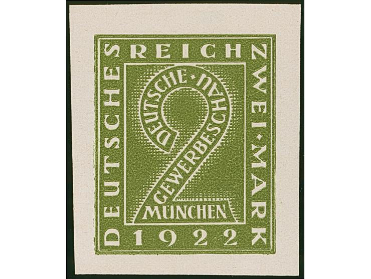 1922, Gewerbeschau München 2 Mark, sieben verschiedenfarbige ungezähnte Essays im Großformat auf Kunstdruckpapier ohne Gummierung, Falzrest, nach einem Entwurf von S. von Weech, in tadelloser Erhaltung