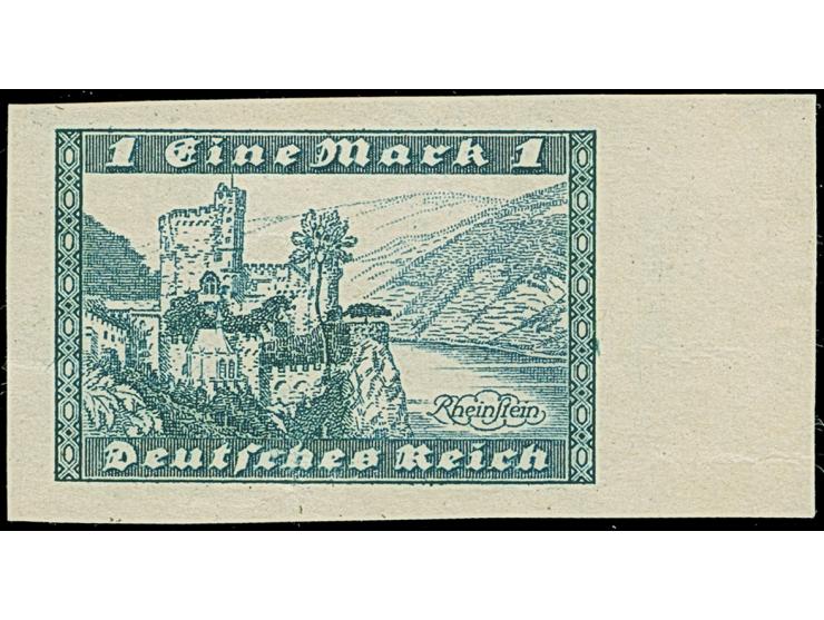 1924, Burg Rheinstein 1 M. schwärzlichgrautürkis, Probedruck, ungezähnt auf ungummiertem Papier, ohne Wasserzeichen, mit rechten Bogenrand, leichte Knitterspuren am Unterrand. Eine große Seltenheit, ProFi hat keine handvoll Stücke registriert, Fotoattest H.-D. Schlegel BPP (2026)