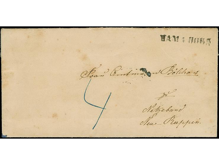 1857, "HAM & HORN", Langstempel, sauber abgeschlagen auf komplettem, unbezahltem kleinen Faltbrief von Hamm nach Neuruppin; rückseitig durch Langstempel des Stadtpost-und preußischen Postamtes.