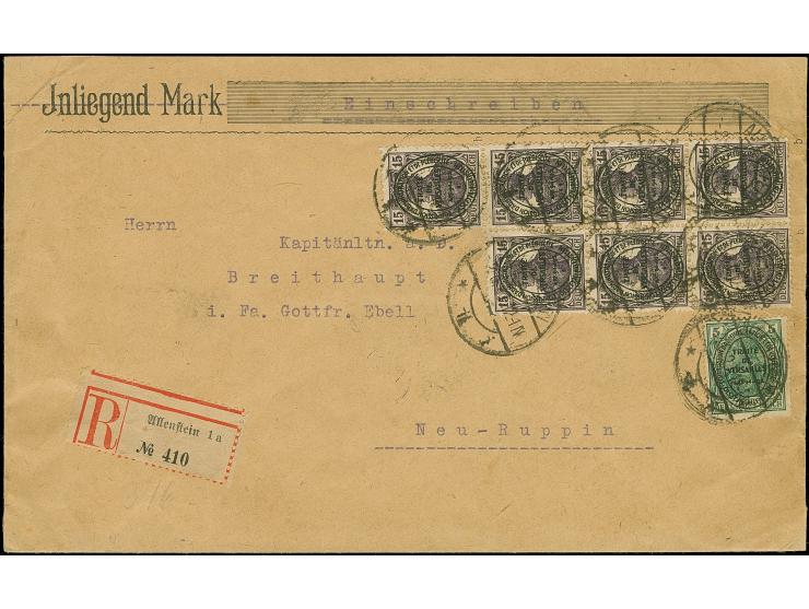 1920, Aufdruckausgabe im Hochoval 15 Pfennig schwarzviolett, 7er-Block mit Zufrankatur mit Stempel “ALLENSTEIN 2.6.20” auf portogerecht frankiertem R-Brief nach Neu-Ruppin mit Ankunftsstempel, die Zufrankatur kleiner Zahnfehler, sonst tadellos, Fotoattest Gruber BPP (2020)