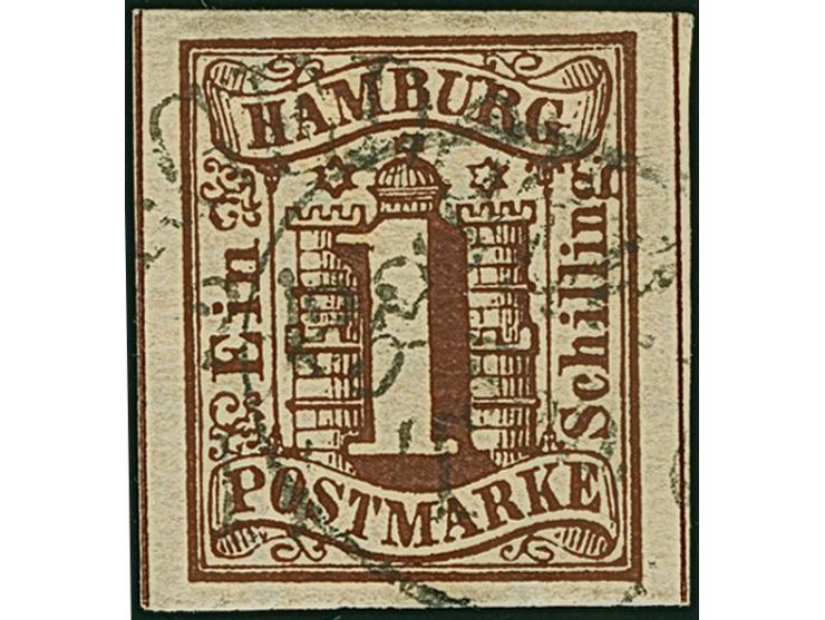 1 Sch. braun, voll- bis breitrandig mit Doppelentwertung durch Ortsstempel und Hamburger Ovalstempel. Im Unterrandd kleinne Aufspaltung außerhalb des Markenbildees, sonst tadellos. Fotoattest Dr. Mozek BPP (2026)