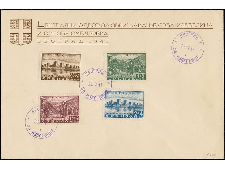 1941, Semendria 0,50+1 - 2+4 Dinar, 1+2 Dinar mit Plattenfehler “fehlendes S im kyrillischen Entwerferzeichen”, sauber mit violettem Ersttagsstempel “BEOGRAD 22.IX.41” auf Schmuckumschlag, tadellos, sign. Dr. Zydek BPP
