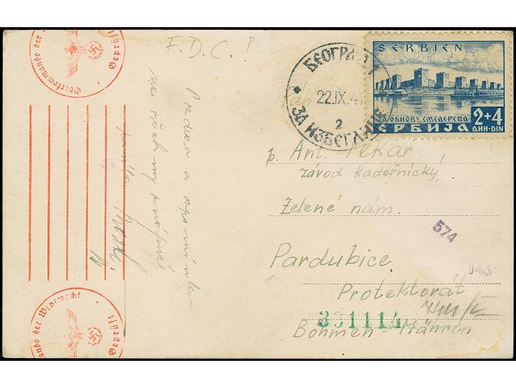 1941, Semendria 2+4 Dinar, sauber mit Ersttagsstempel “BEOGRAD 22.IX.41” auf zensierter Ansichtskarte nach Pardubice im Protektorat Böhmen und Mähren, winzige Altersfleckig, sonst tadellos, eine seltene Frankatur