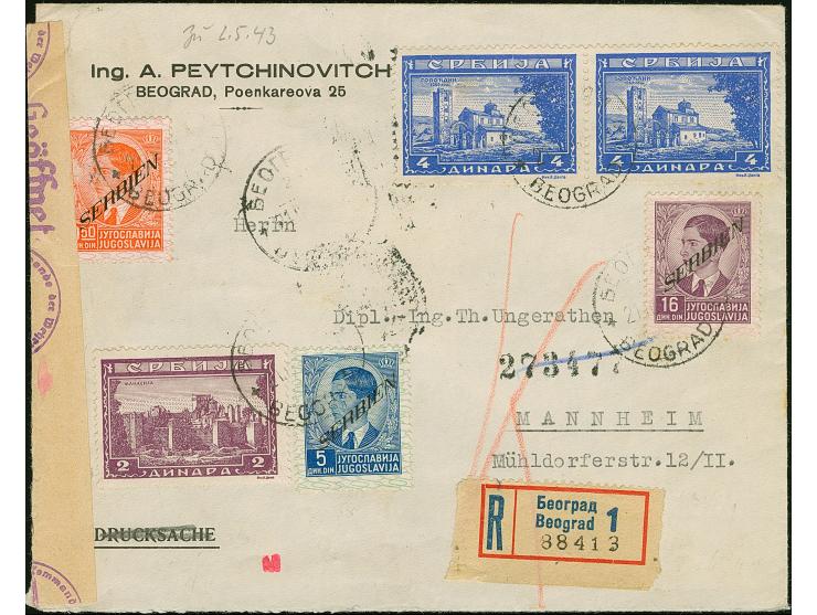1941, König Peter II. 16 und 5 sowie 0,50 Dinar mit Zufrankatur mit Stempel “BEOGRAD 21.IV.43” auf R-Brief mit Zensurstreifen nach Mannheim mit Ankunftsstempel, winzig fleckig, sonst tadellos, Befund Kleymann BPP (2012)