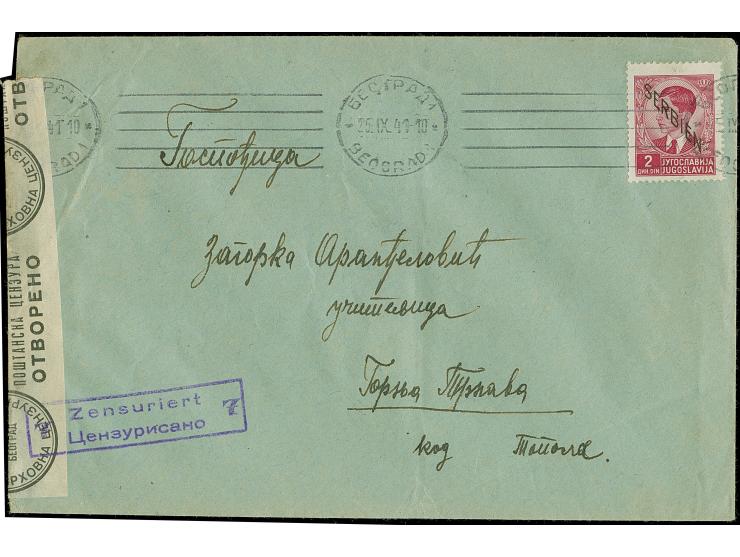 1941, König Peter II. 2 Dinar lilakarmin, ohne Netzüberdruck, sauber mit Maschinenstempel “BEOGRAD 25.IX.41” auf portogerechtem, zensierten Brief nach Topola, die Marke winzig verkürzte Zähne, sonst tadellos, ProFi hat kein weiteres Ganzstück in dieser Form registriert, Fotoattest Krischke (2002)