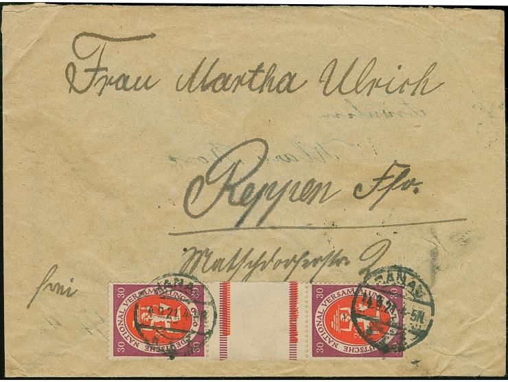 1919, Nationalversammlung 30 Pfg., Zwischenstegpaare mit Stempel “HANAU 14.9.21" auf portogerechtem Fernbrief, übliche Beförderungsspuren, die obere Marke ein fehlender Zahn, sonst gute Erhaltung, Fotoattest Weinbuch BPP (2010)