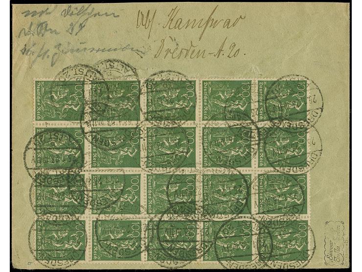 1921, Arbeiter 100 Pfg. schwarzgrün, 20er-Block, farbfrisch und gut gezähnt, sauber mit Stempel “DRESDEN 25.1.23” rückseitig auf portogerechtem Brief nach Gorbitz mit vorderseitigem Ankunftsstempel, tadellos, sign. Infla