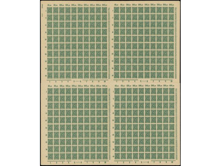 1922, Posthorn 4 M. dunkelgrün, kompletter ungezähnter Druckbogen zu 400 Werten, mit 4 Schalterbogen zu 100 Werten, an allen Seiten vollständige Seitenränder. Mit senkrechten sowie waagerechten Zwischenstegpaaren, dem Herzstück, vier HANs sowie dem Druckerzeichen “Ahlert”, postfrisch, zwischen den Bögen übliche Faltung, tadellos. Eine der großen Seltenheiten, ProFi hat kein weiteres derartiges Stück registriert, das Herzstück damit ebenfalls Unikat