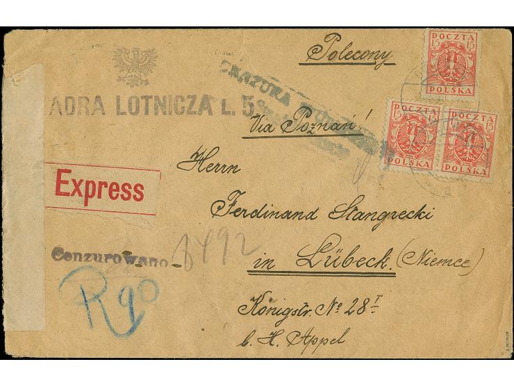 1919, Coat of arms 15 f. red, horizontal strip of five, of three, two horizontal pairs and single, tied by cds. “DZURYN 4 XII 19” to front and reverse of registered express letter from the Polish 5th Air Force Squadron in Dżuryn near Czortków, with provisional, handwritten registration label “R90” to Lübeck, Germany with arrival mark. Straight-line “Cenzurowano” on front and reverse. Further strike of boxed “CENZURA WOJSKOWA / w Stanisławowie” alongside, at left censor label “Auf Grund der Verordnung…”. A very rare letter sent abroad; normal domestic mail for military correspondence was postage-free, but the normal fee had to be paid for letters abroad, usual transportation wear, otherwise very fine, signed and certificates Drewiecki (2015) and Petriuk (2025)