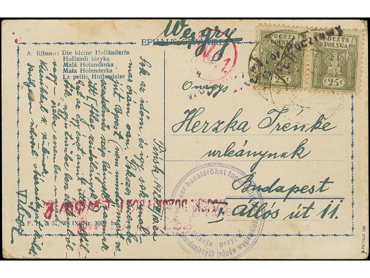 1920, field postcard from the camp for returning Hungarian prisoners of war in Pinsk with violet cachet “tacja przyjęć powracających jeńców węgierskich” (=Reception station for returning Hungarian prisoners of war), franked with horizontal pair Coat of arms 25f. olive and tied by cds. “PINSK,” addressed to Budapest, with censor marks “Wojskowy Dozór Pocztowy / LWÓW 1”, “NIEPODLEGA KONTROLI / WOJSK. DOZÓR POCZT. LWOW 2” (=not subject to control/Military Postal Control Lwow 2), and “Wr.1” of Warsaw alongside. Why the postage has been applied is unclear, usually this sort of mail was carried postage-free, signed Petriuk with certificate (2025) and certificate Drzewiecki (2019)