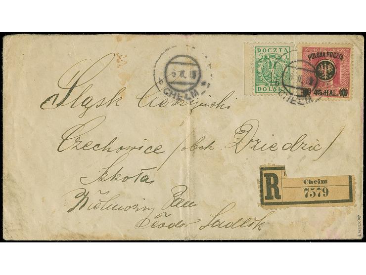 1918, Lublin Issue 45 h. with additional franking, tied by cds. “CHELM 6.II.19” to registered cover, backflap missing and some aging, transporation wear. For the Lublin region (southern Poland), which also included Chelm, the postage rate was temporarily set at 25 H for letters and 25 H for registered mail for a short period from January 7/8, 1919, signed with certificate Petriuk (2025)