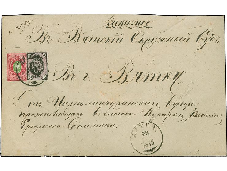 30 k. carmine rose/green and 5 k. black/lilac, fresh colours, tied by cds “YARANSK 21 JAN. 1875” repeated on reverse to 2nd weight step registered envelope to the Justice Court in Vyatka with arrival cds, the 5 kopek pays for the receipt, very fine