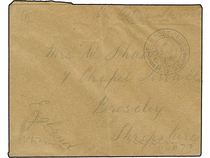 “FIELDPOST OFFICE P.B. 55 23 MY 19” cds, fine strike on small soldier´s envelope to England, vertical fold and flap rebacked, still fine. A scarce mail from the British forces during their intervention in Northern Russia