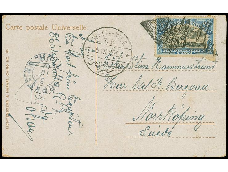 1900, 25 c. light blue/black with manuscript “LADO 30-8-07”, additionally tied by Khartum retta obliterator to postcard to Norrköpping, Sweden with alongside transit bilingual cds “WHITE-NILE -5 IX 1907 *” and arrival cds 3.10.07; the card with negligible lower right corner crease, very fine. A rare usage from the Lado enclave (present-day South Sudan)