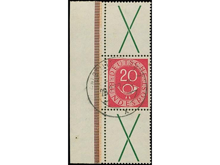 Posthorn X+20+X vom linken Bogenrand, sauber gestempelt "STUTTGART 28.2.52", einwandfrei, Fotoattest A.Schlegel BPP (2024)