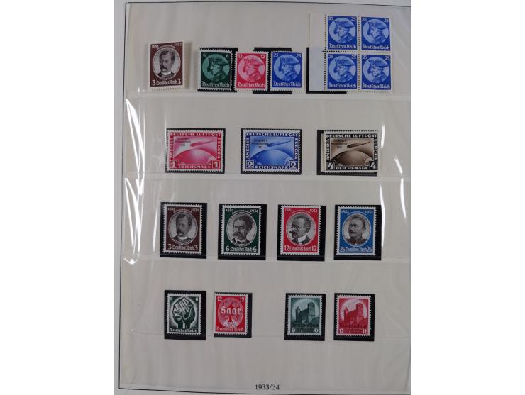 1933/45, meist postfrische Sammlung im Lindner-Falzlosalbum komplett mit vielen Besonderheiten. Mi. 482-495 postfrisch, Höchstwerte sign. A. Schlegel BPP, Mi. 496-98 ungebraucht, Mi. 507 postfrisch, Befund Schlegel BPP, Block 2 postfrisch (1 mm erhöht sign. Schlegel BPP), Mi. 529-539 x und Viererblock 539 y je postfrisch mit Attest Schlegel BPP,  Bl. 3 Attest A. Schlegel BPP, Mi. 586 Y ungebraucht, Attest Oechsner BPP, Mi. 587 U ungebraucht, Attest H.-D. Schlegel BPP, Block 6z postfrisch, sign. Schlegel BPP, Mi. 641 x postfrisch, sign. D. Schlegel BPP, Mi. 659 x postfrisch, Befund Oechsner BPP, Mi. 671 x und 672 y sign., Mi. 814 Phasenabzug und Abzug vom Urstempel je postfrisch, viele Plattenfehler wie 909 I und 910 I und II je sign. A. Schlegel BPP.