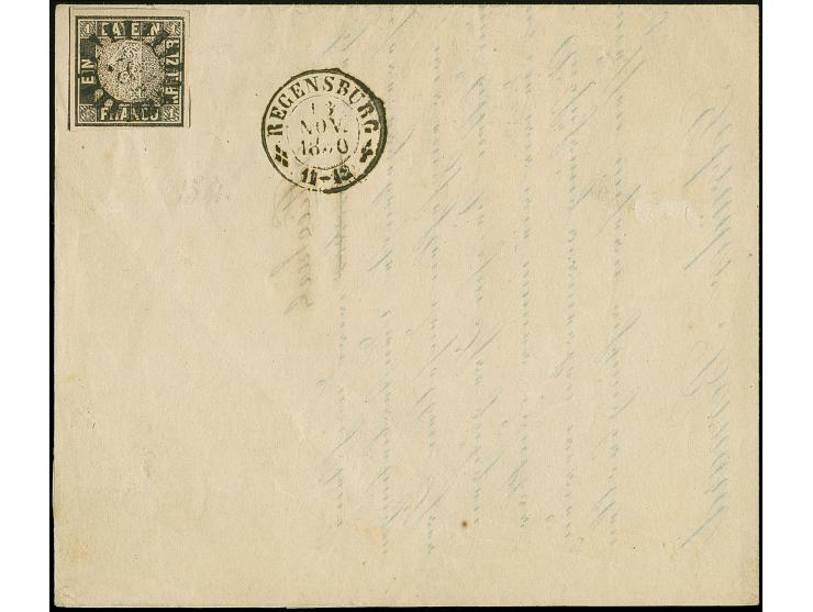 1849, 1 Kr. schwarz, Platte 1, farbfrisch und allseits voll- meist breitrandig geschnitten, links mit durchgehender Trennungslinie, sauber mit gMR “281” und nebengesetztem DKr. “REGENSBURG 13 NOV 1850” auf Vertreterankündigung ohne Adressschleife, tadellos, ein schönes und ursprüngliches Ganzstück aus dem November, Fotoattest Stegmüller BPP (2025)