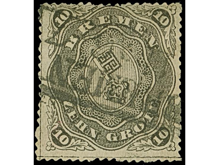 1863, 10 Gr. mit Durchstich D1I, sauber mit Rahmenstempel “BREMEN” (KS 120) entwertet. Die farbfrische Marke mit allseits sauberem Durchstich ist in einwandfreier Erhaltung, sign. Drahn, Carl H. Lange und Fotoattest Heitmann BPP (2010)
