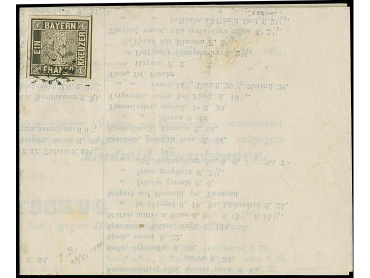 1849, 1 Kr. schwarz, Platte 1, farbfrisch und allseits breitrandig geschnitten, oben und rechts mit durchgehender Trennungslinie, sauber mit gMR “217” (=MÜNCHEN) auf Drucksache (gedruckte Preisliste) ohne Adressschleife, tadellos, ein schönes und ursprüngliches Ganzstück, Fotoattest Stegmüller BPP (2025)