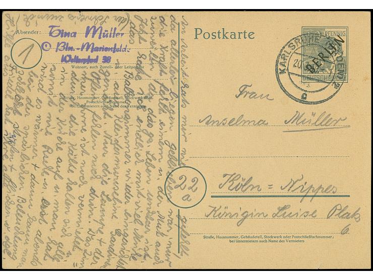 1948, Schwarzaufdruck Karte 12 Pfg. bedarfsgebraucht mit Stempel “KARLSRUHE 20.3.49” ohne Nachgebühr nach Köln, in guter Erhaltung. Eine ganz ungewöhnliche Verwendung als Reisekarte in Westdeutschland