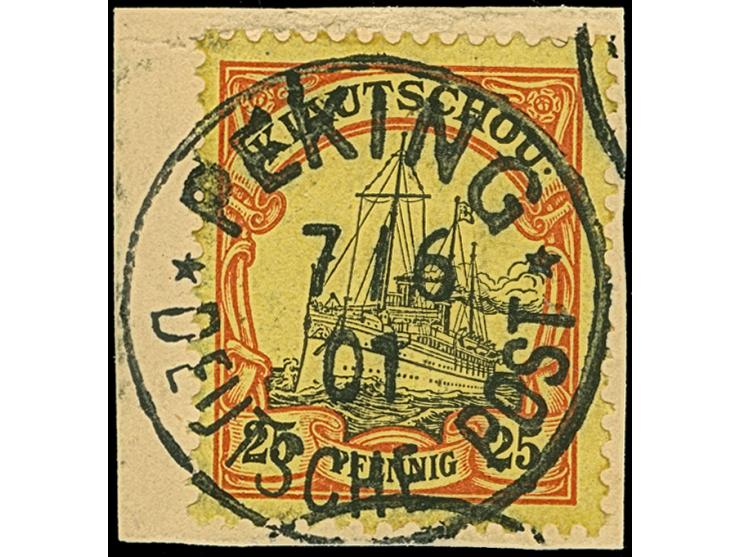 PETSCHILI: Kiaoutschou 25 Pfg. rötlichorange/gelbschwarz, farbfrisch und gut gezähnt, sauber mit EKr. “PEKING 7/06 01” auf Briefstück, tadellos, sign. Bothe sowie Fotoattest Steuer BPP (2009)