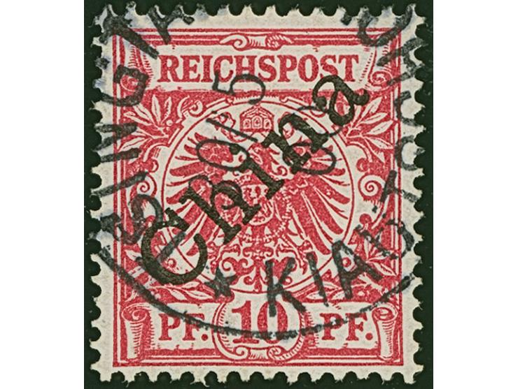 1898/1901, China Diagonaler Aufdruck 10 Pfg. rotkarmin, farbfrisch und gut gezähnt, sauber mit Stempel “TSINGTAU KAIUTSCHOU 30/5 00” entwertet, tadellos, ein schönes Stück dieser seltenen Marke, Fotoattest Steuer BPP (2008)