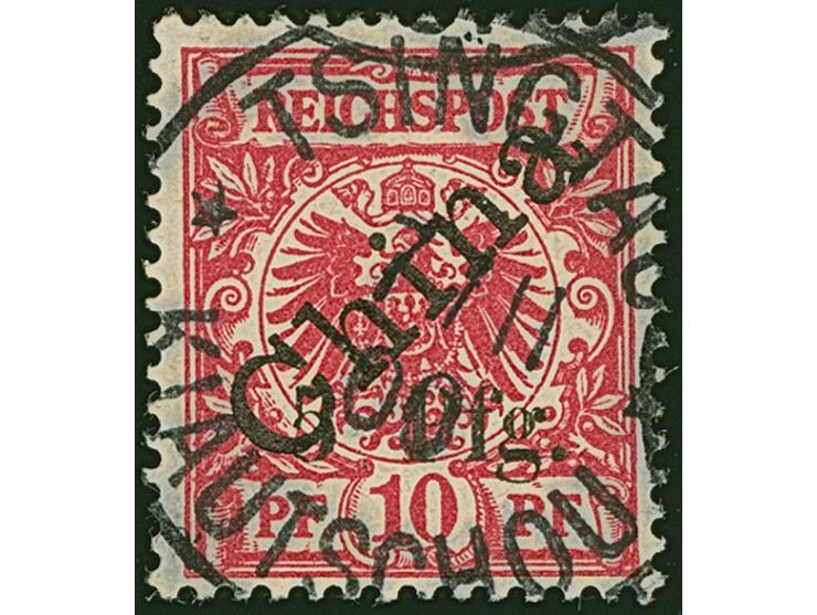 1900, 1. Tsingtau-Ausgabe, Diagonaler Aufdruck, 5 auf 10 Pfg. lebhaftlilarot, Aufdrucktype 3, ohne Blaustrich, farbfrisch und sehr gut gezähnt, sauber und fast zentrisch entwertet “TSINGTAU 7/11 00”, tadellos, ein schönes Stück dieser nicht häufigen Marke, sign. Bothe BPP und Fotoattest Jäschke-L. BPP (2018)