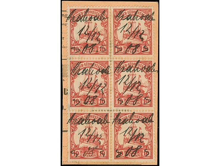"Arahoab 12/12 08" jeweils sauber handschriftlich auf senkrechtem 6er-Block 10 Pfg. auf Postanweisungsabschnitt mit Ankunftsstempel von Windhuk. Ein Wert Zahnfehler und die Einheit senkrecht gefaltet. Ein äußerst seltenes Stück; größte von PROFI registrierte Einheit mit dieser Aushilfsentwertung.
