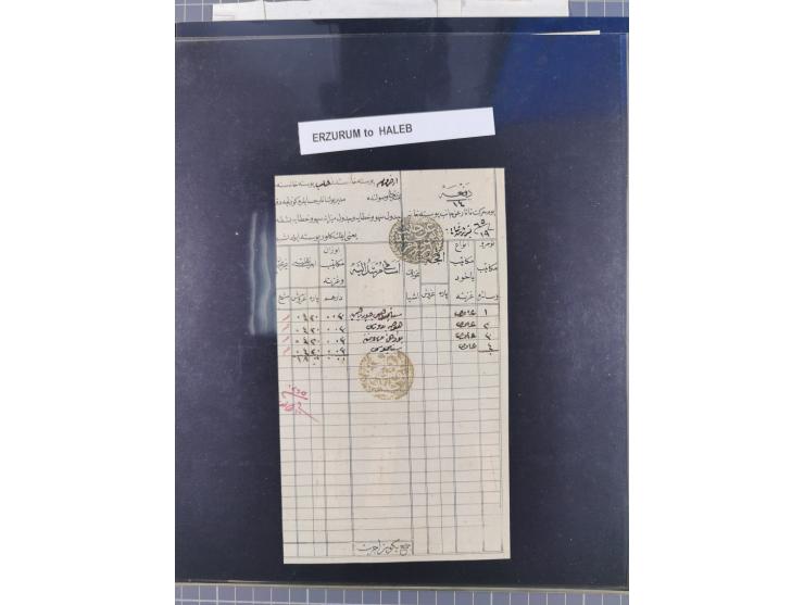 1840/60, „AN CANIB-I POSTA-I SHAM“ & „AN CANIB-I POSTA-I HALEB“, clear arabic negative seals on nine Tatar Post‘ printed forms for mail carried to and from Syria, old map of Syria, Palestine and Lebanon, very rare prefilatelic postal history.