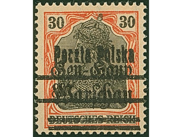 1918, Germania 30 Pfg., “Gen.-Gouv. Warschau” with variety semi-glossy double overprint, unused, very fine. A very scarce stamp, certificate Berbeka (2012) (Fischer-Nr. 14INp)