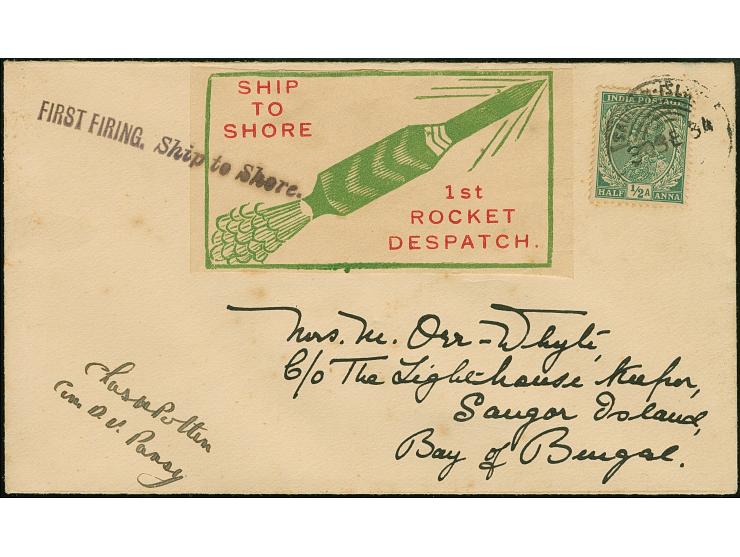 Indien: 1934, Rakete Nr. 1 vom 30.09., Brief mit grüner Vignette und Freimarke ½ A. mit Stempel “SAUGOR-ISLANDS 30.SEP.34” sowie rückseitiger e. Unterschrift von Stephen H. Smith, leicht fleckig