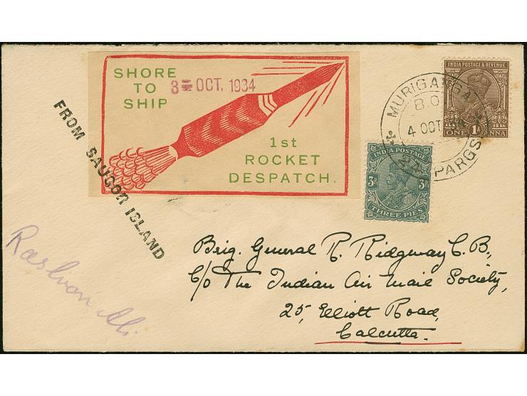 Indien: 1934, Rakete Nr. 9 vom 3.10., Brief mit roter Vignette und Freimarken 3 P. und 1A. mit Stempel “MURIGANGA 4.OCT.34” sowie rückseitig e. Unterschrift von Stephen H. Smith, etwas fleckig
